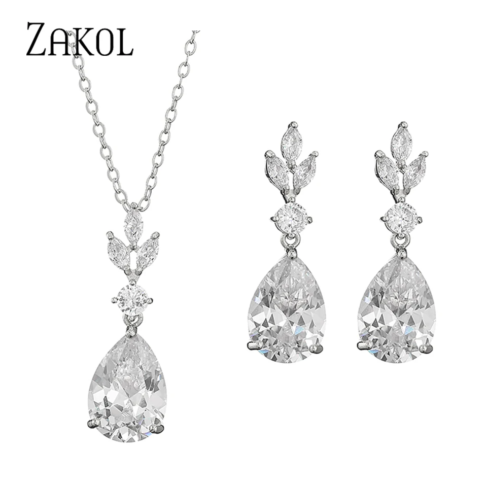 ZAKOL Brand Water Drop Zirconia Jewelry Set High Quality CZ Crystal Stone Earrings & Pendent Necklace Set For Women Girl FSSP363