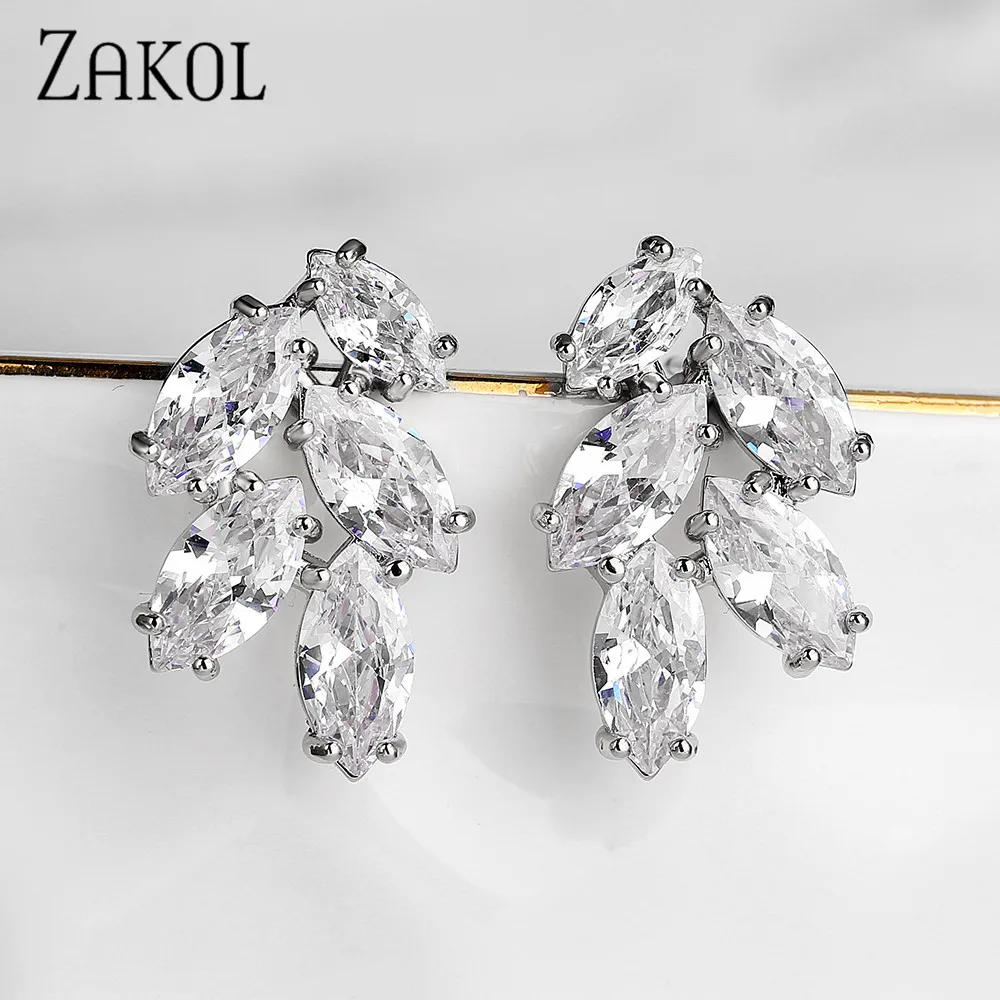 ZAKOL Fashion Leaf Zircon Wedding Earrings for Women White Gold Color Marquise Crystal Bridal Earring Party Jewelry Gift