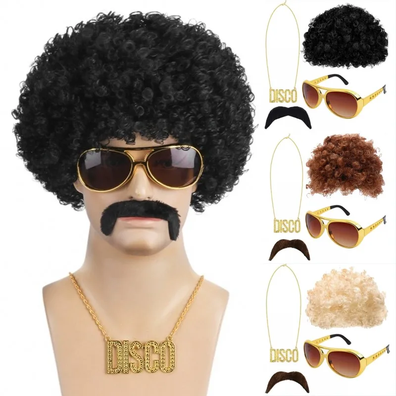 Adult Hippie Synthetic Wig Hat Set Funny Disco Party Cosplay Dress Up Costume Props Head Cover Wig Hair Sunglass Chain Necklace